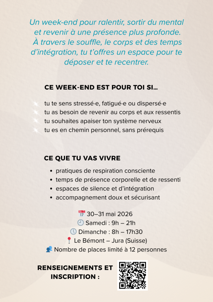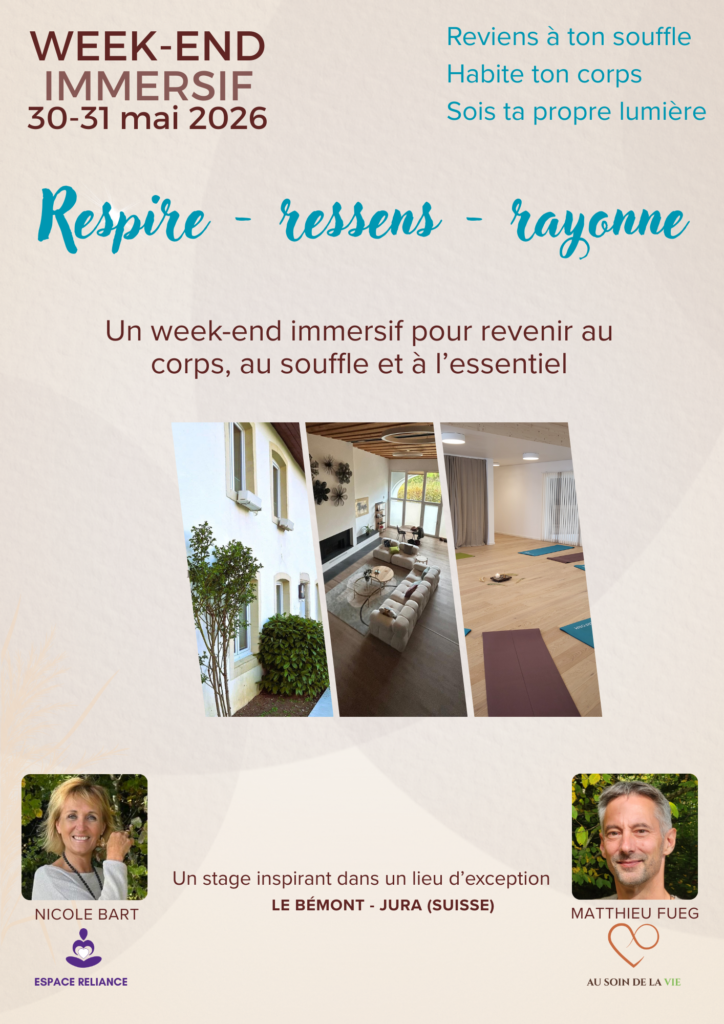 Nous nous réjouissons de vivre en ta présence ce temps fort qui amènera à retrouver la puissance de ton silence intérieur et être pleinement au cœur de ce magnifique temple qu’est le corps.